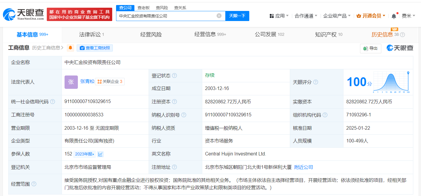 南方财经2月5日电,天眼查App显示,近日,中央汇金投资有限责任公司发生工商变更,彭纯卸任法定代表人、董事长,由张青松接任。该公司成立于2003年12月,注册资本约8282亿人民币,经营范围为接受国务院授权,对国有重点金融企业进行股权投资;国务院批准的其他相关业务,由中国投资有限责任公司全资持股。此前,中央汇金发布关于董事长调整情况公告,经国务院批准,张青松担任公司董事长,彭纯不再担任公司董事长职务。
